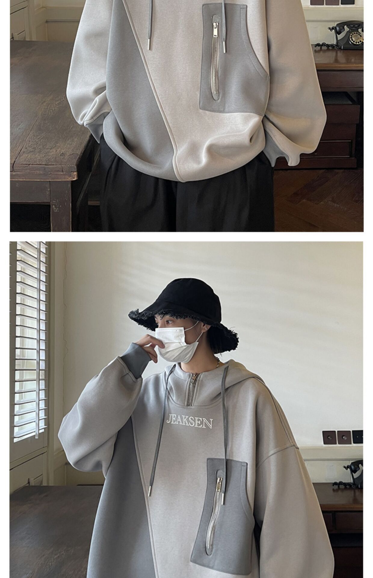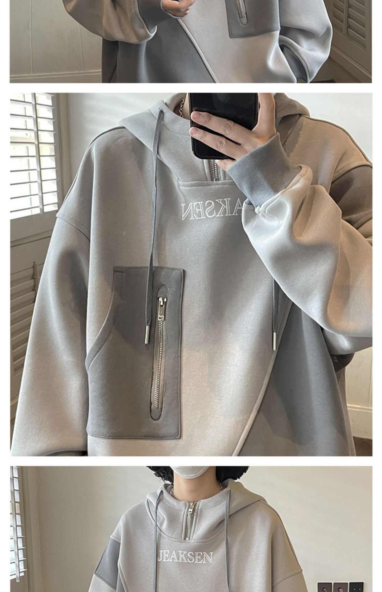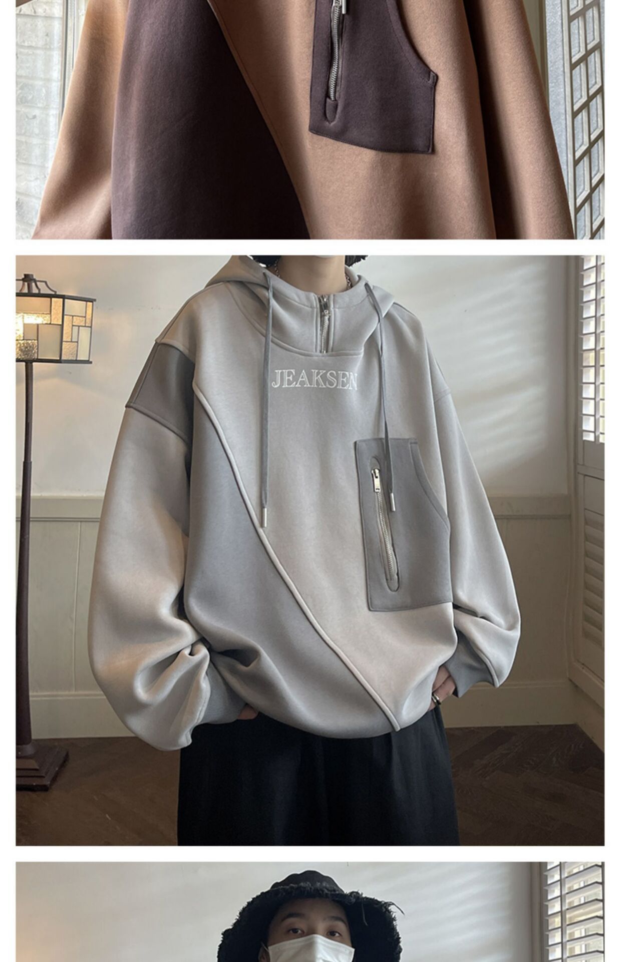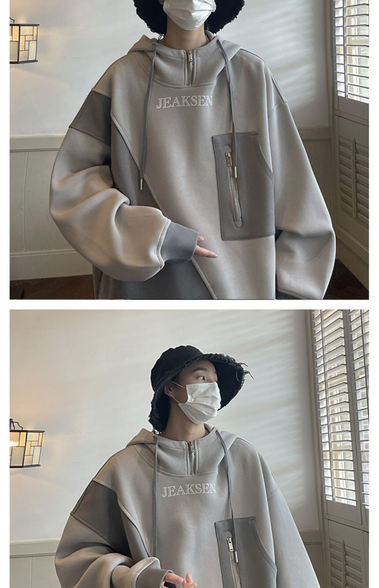加绒加厚卫衣男生2022年秋冬款ins潮牌高街设计感半拉链连帽外套