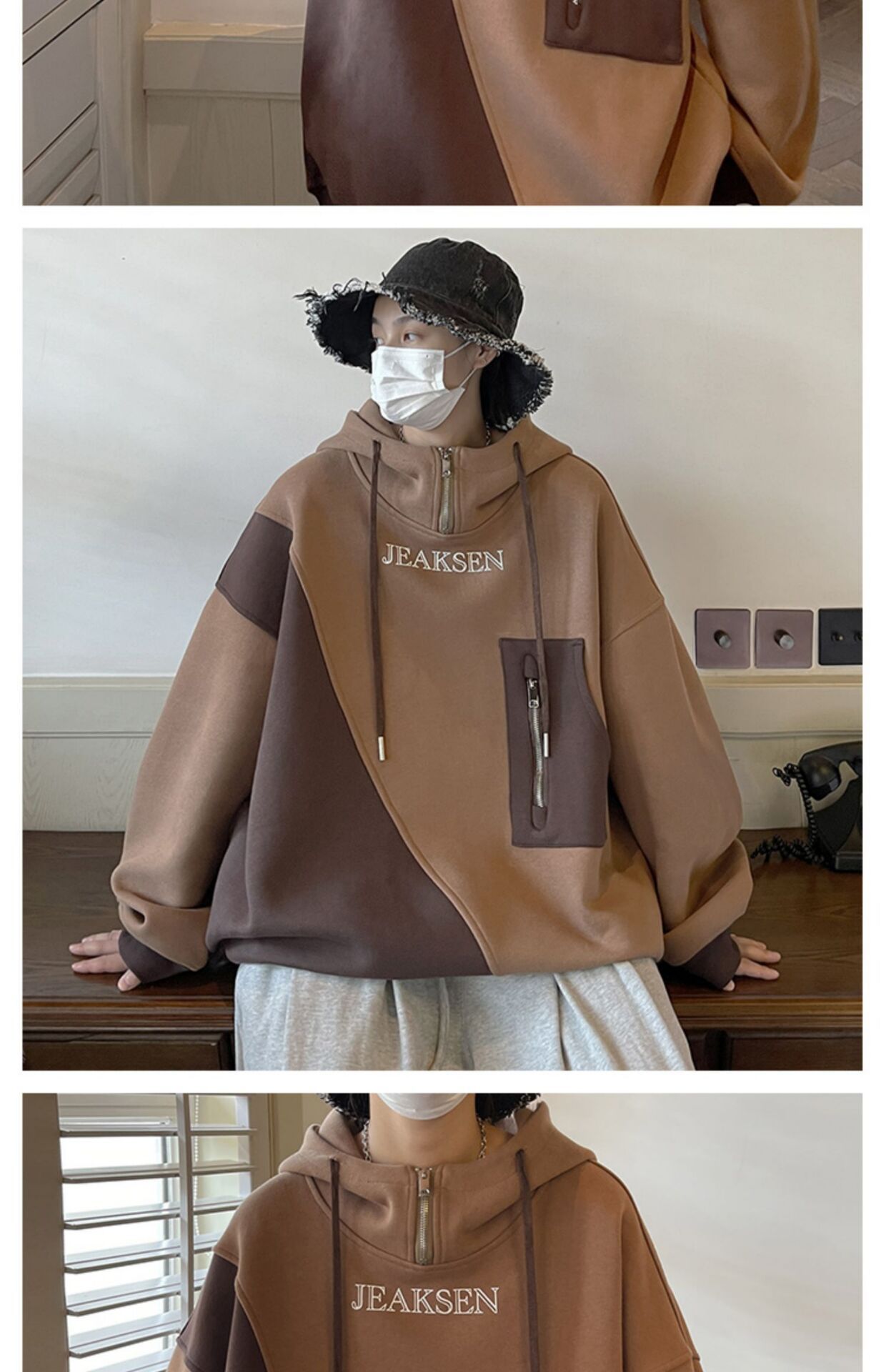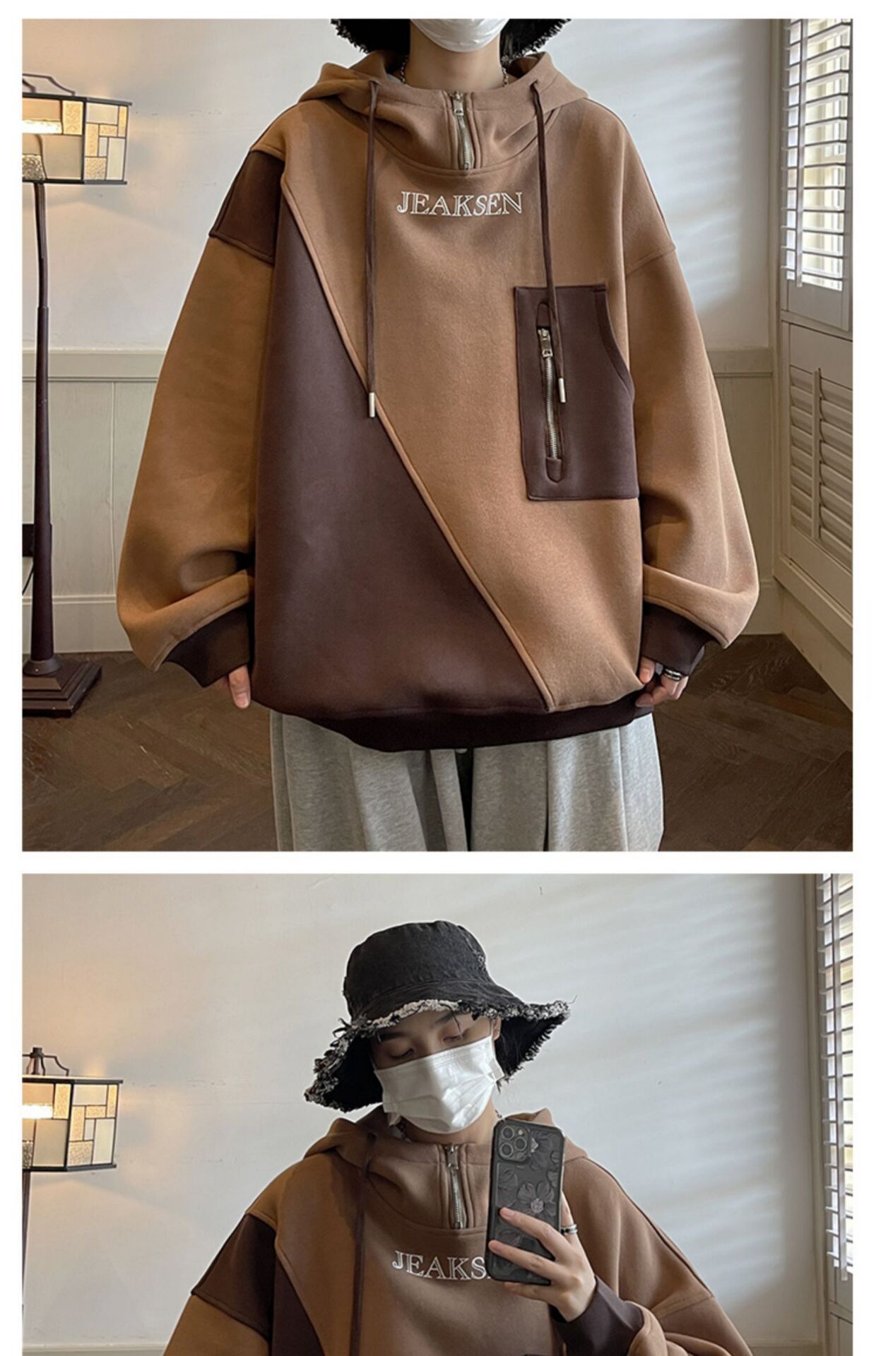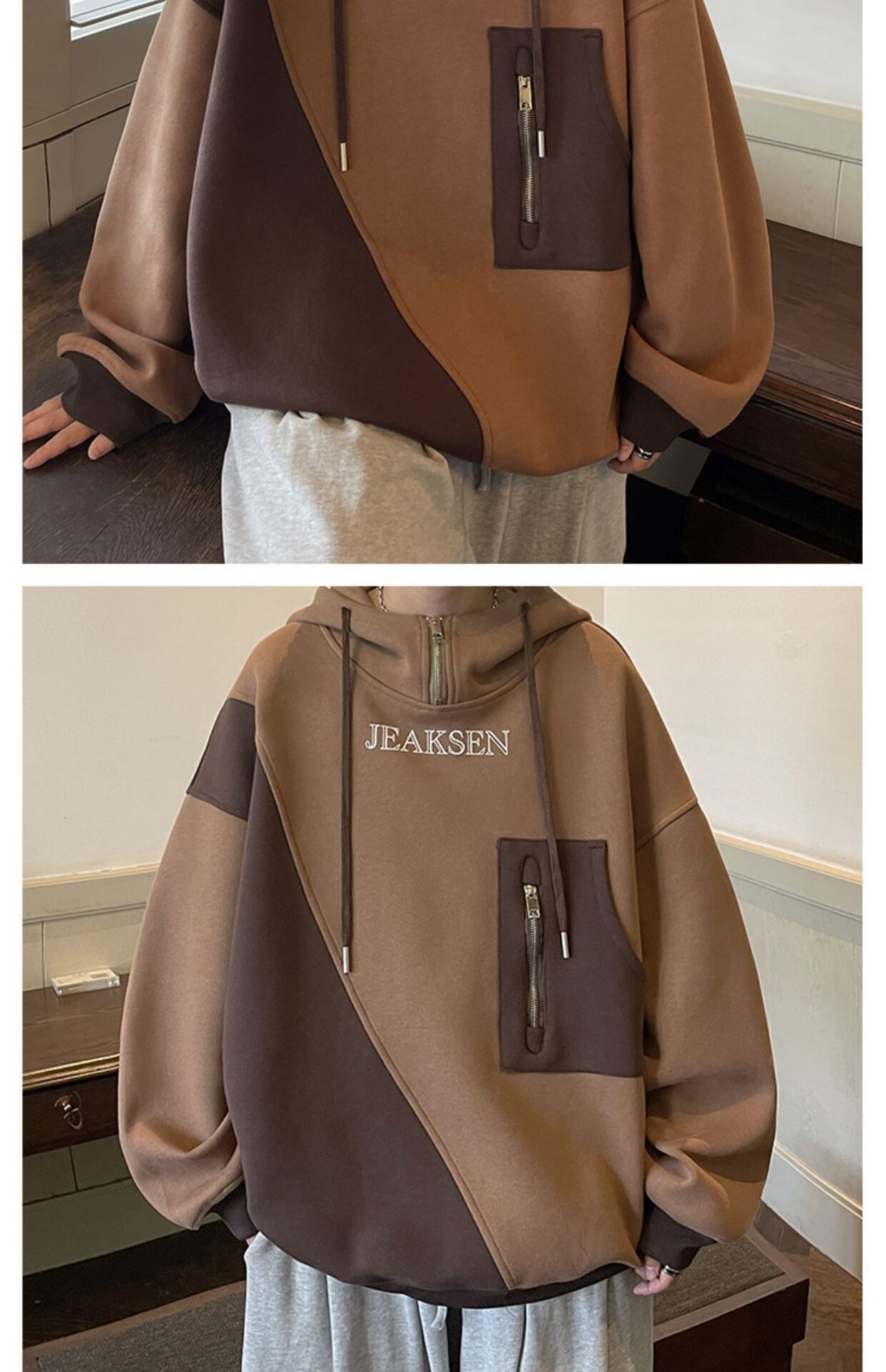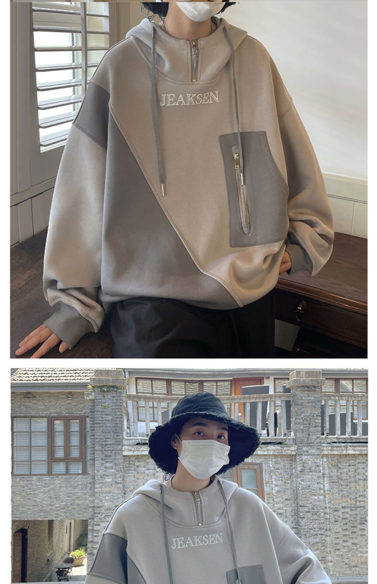 加绒加厚卫衣男生2022年秋冬款ins潮牌高街设计感半拉链连帽外套