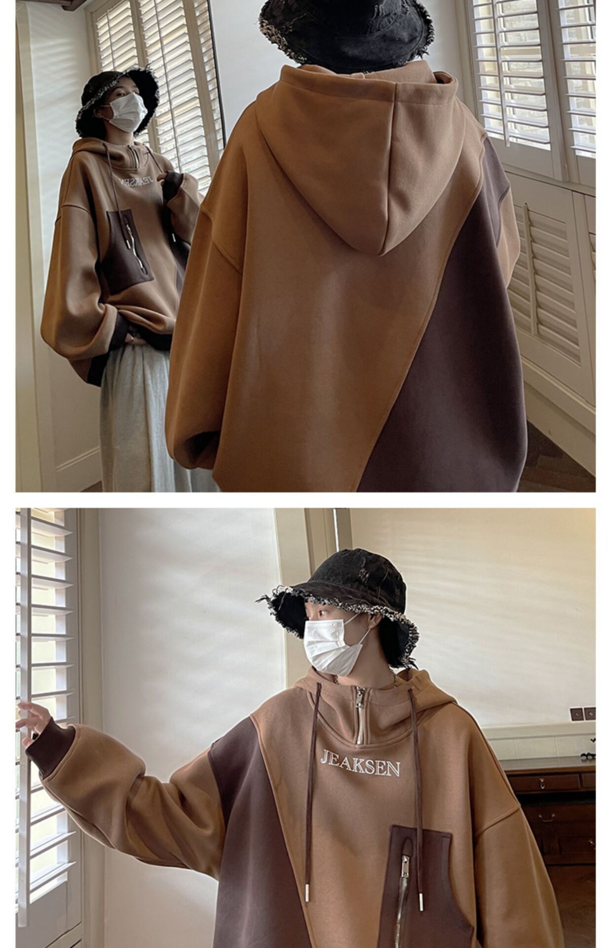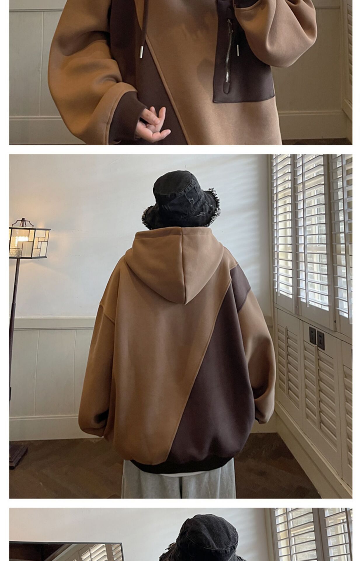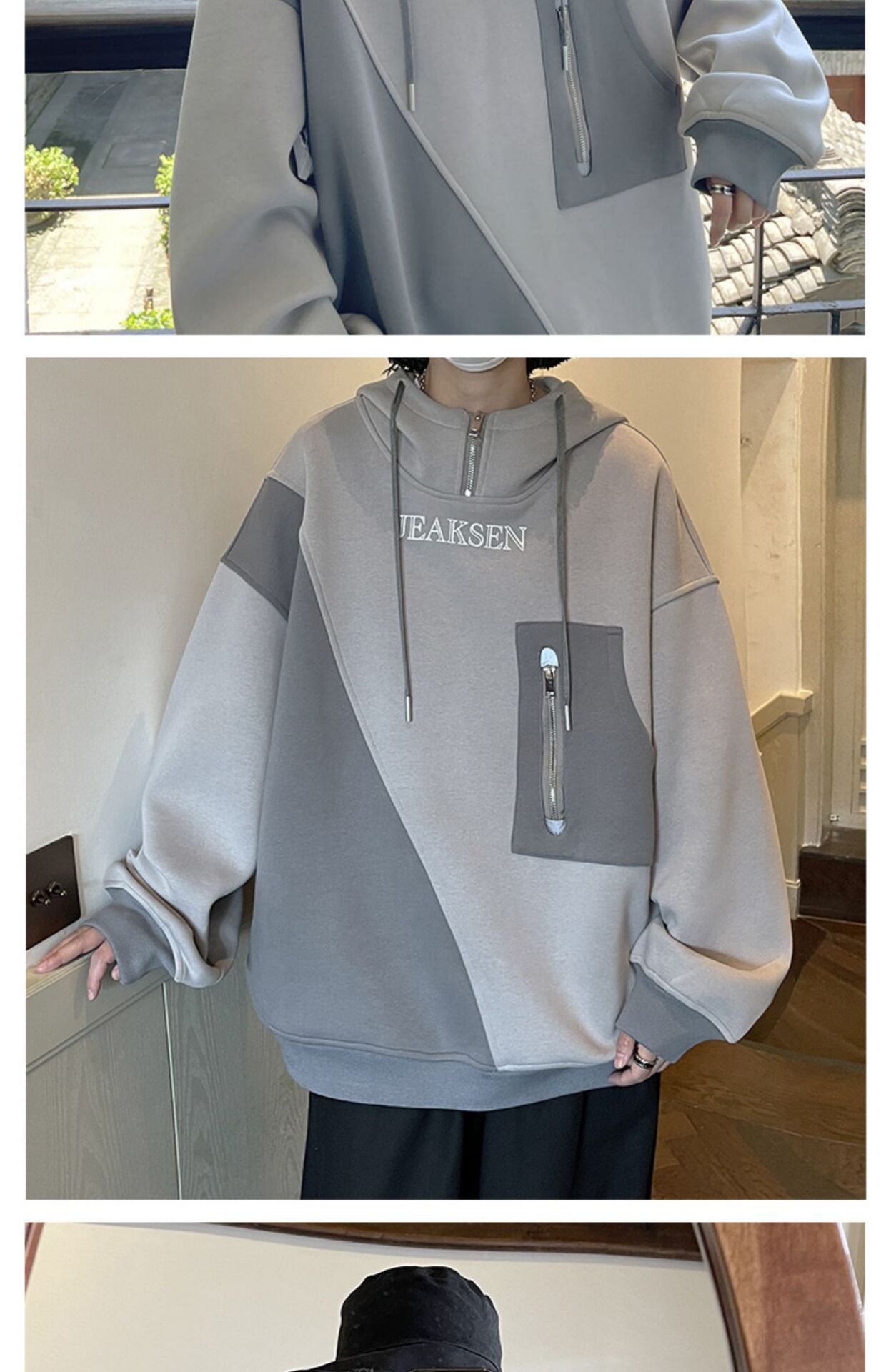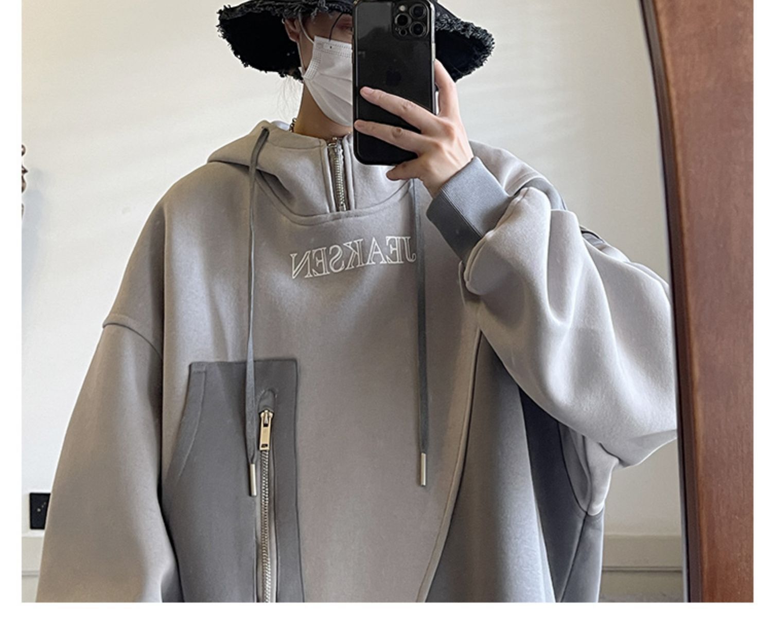 加绒加厚卫衣男生2022年秋冬款ins潮牌高街设计感半拉链连帽外套