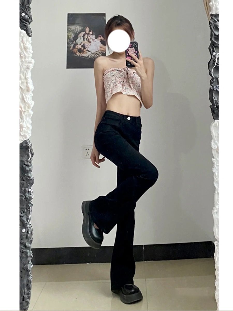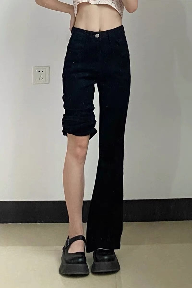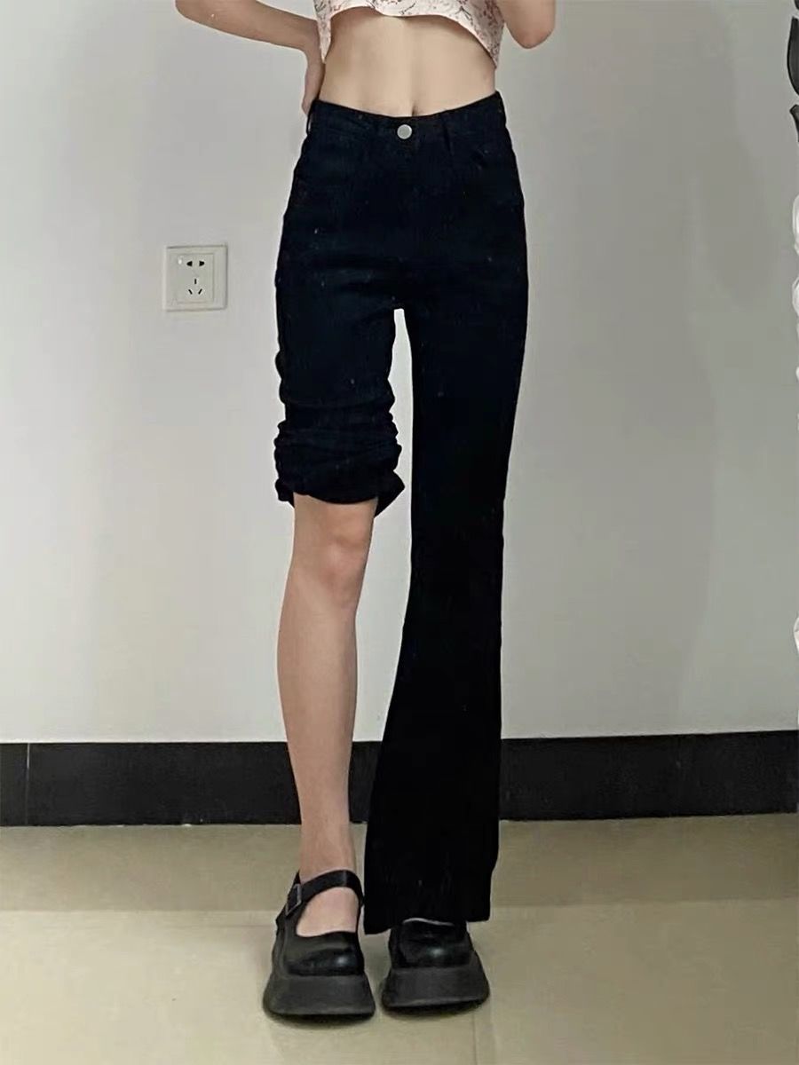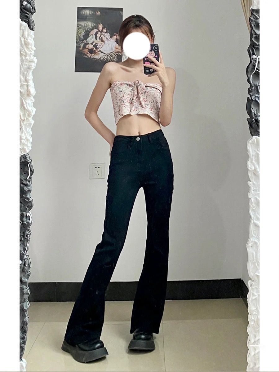 黑色高腰微喇牛仔裤女2023年春秋季新款宽松显瘦弹力直筒阔腿裤子