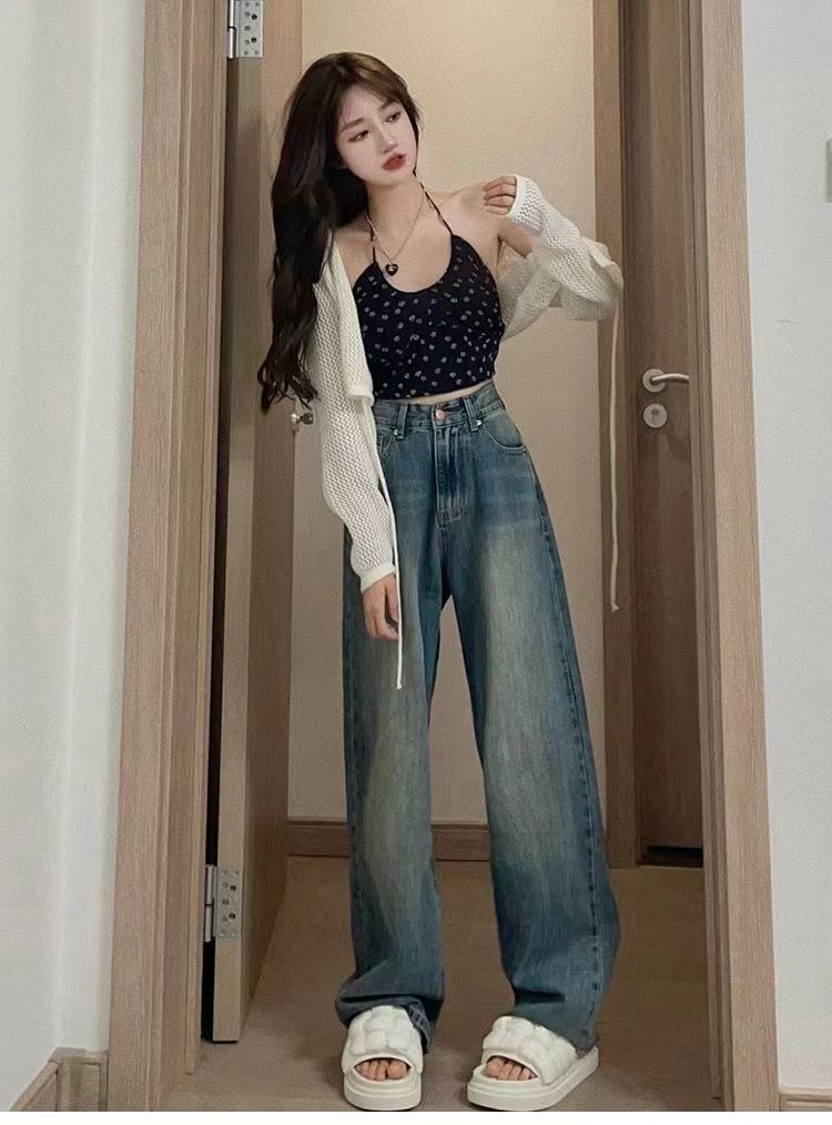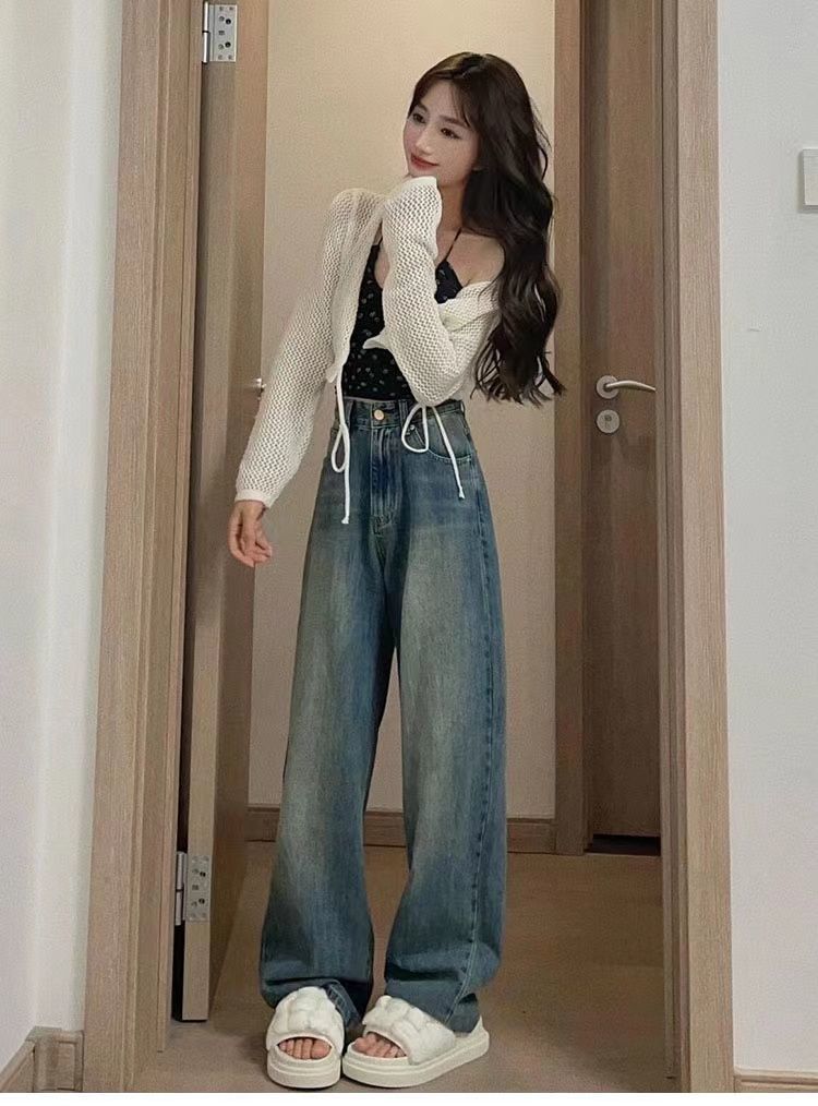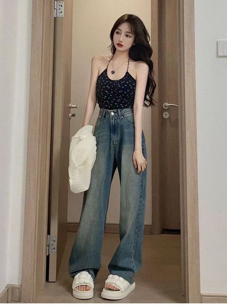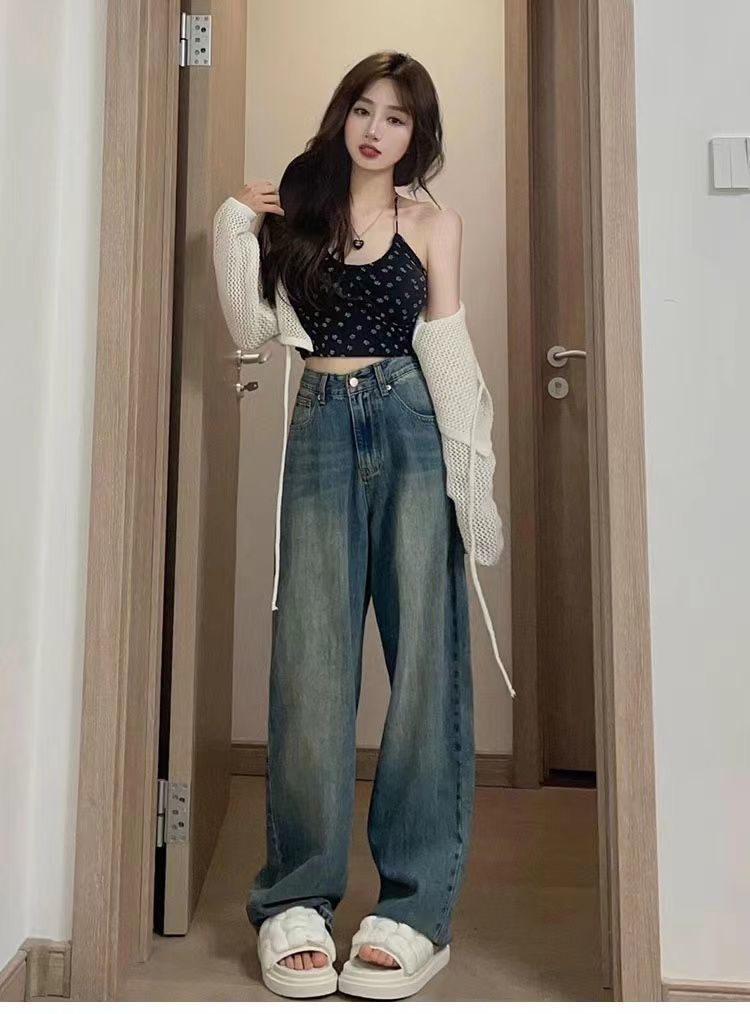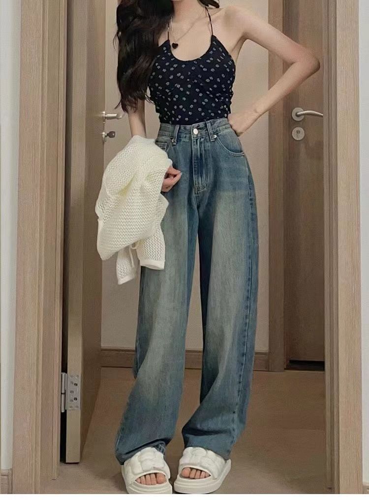 水洗复古阔腿牛仔裤女春秋新款韩系港风宽松高腰显瘦直筒拖地裤子