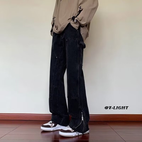 欧美风裤子vibe潮牌痞帅炸街阔腿裤oversize裤脚拉链牛仔裤高街男