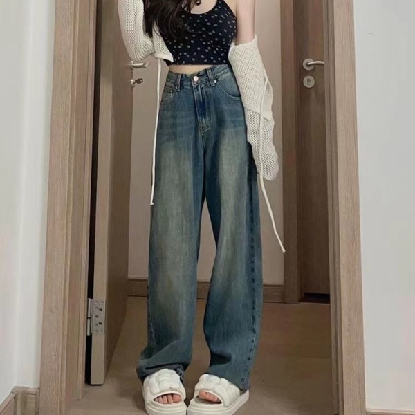 水洗复古阔腿牛仔裤女春秋新款韩系港风宽松高腰显瘦直筒拖地裤子