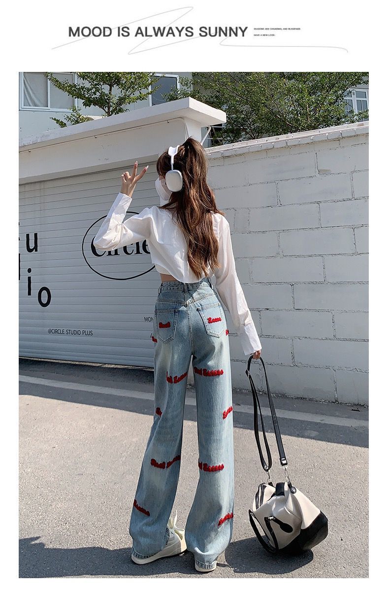 字母刺绣牛仔裤女大码胖mm高腰显瘦设计感小众美式复古直筒阔腿裤
