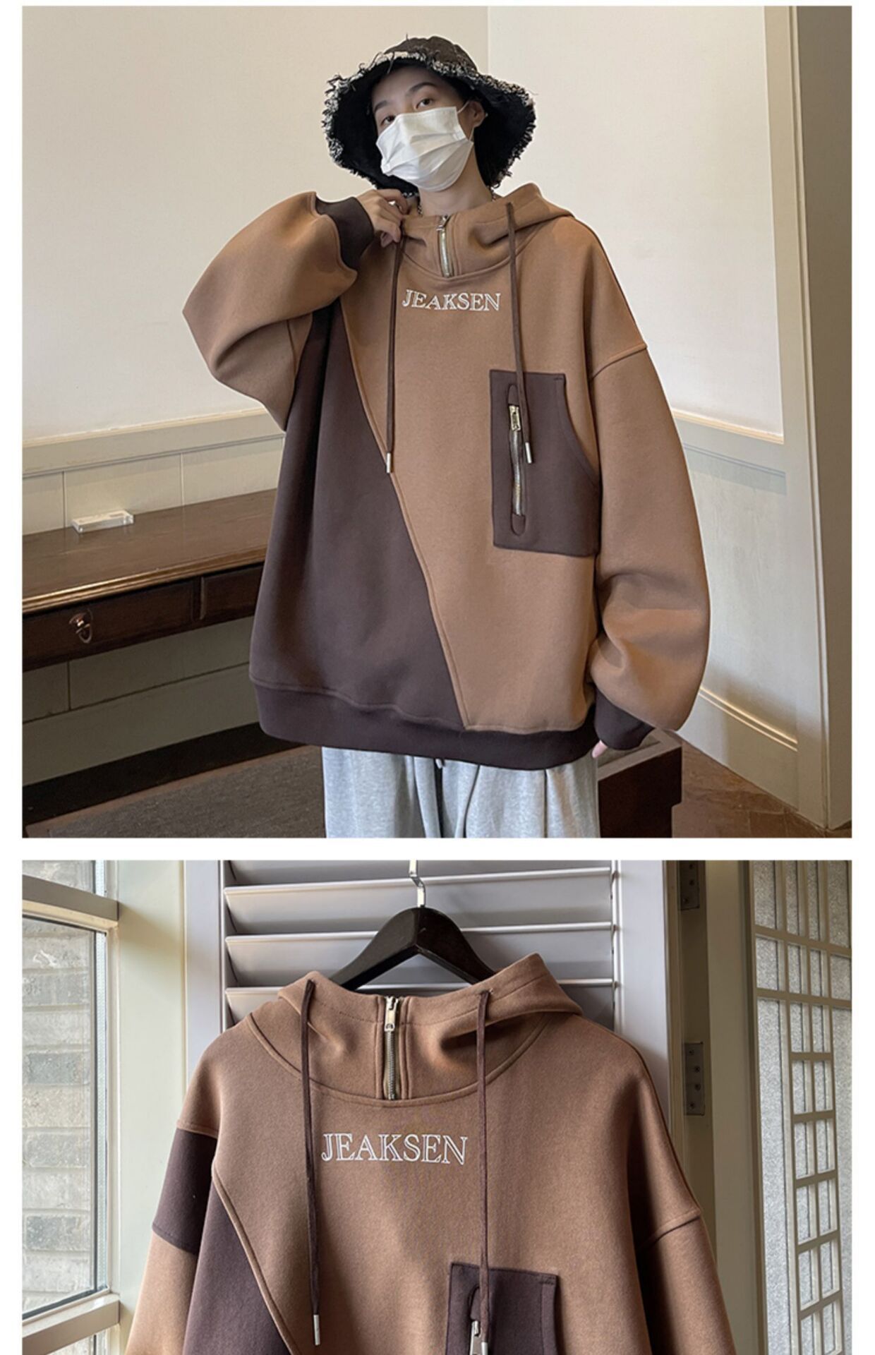 加绒加厚卫衣男生2022年秋冬款ins潮牌高街设计感半拉链连帽外套